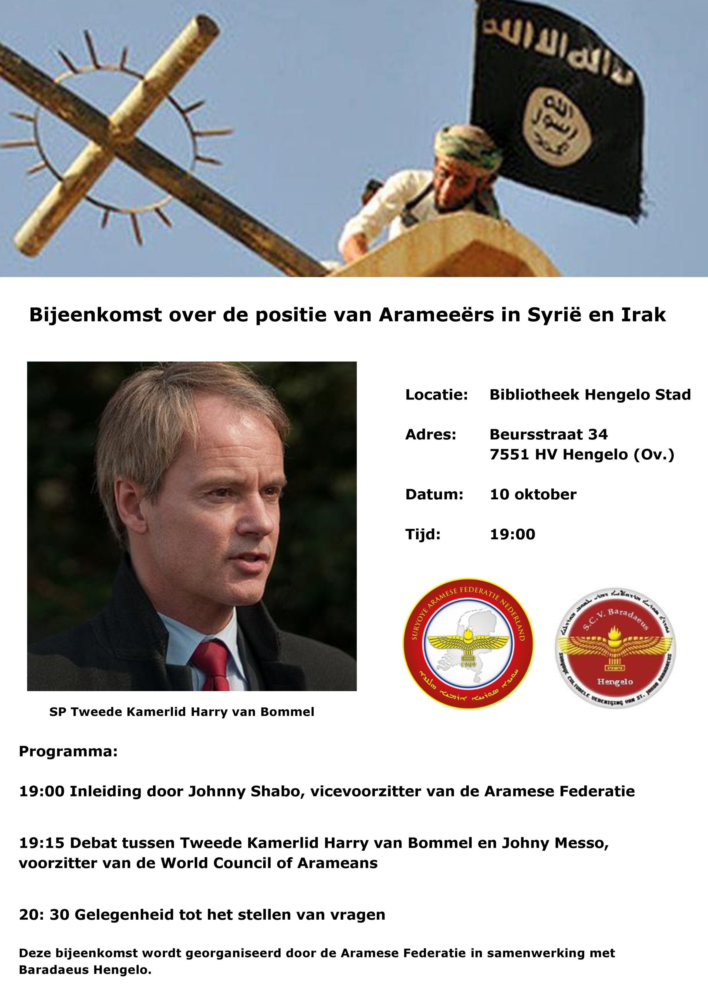 Op maandagavond 10 oktober organiseert de Aramese Federatie samen met Baradaeus Hengelo een bijeenkomst over de positie van Arameeërs in Syrië en Irak. Voorzitter van de World Council of Arameans Johny Messo en SP Tweede Kamerlid Harry van Bommel gaan hierover in debat. De inleiding wordt gehouden door Johnny Shabo, vicevoorzitter van de Aramese Federatie.