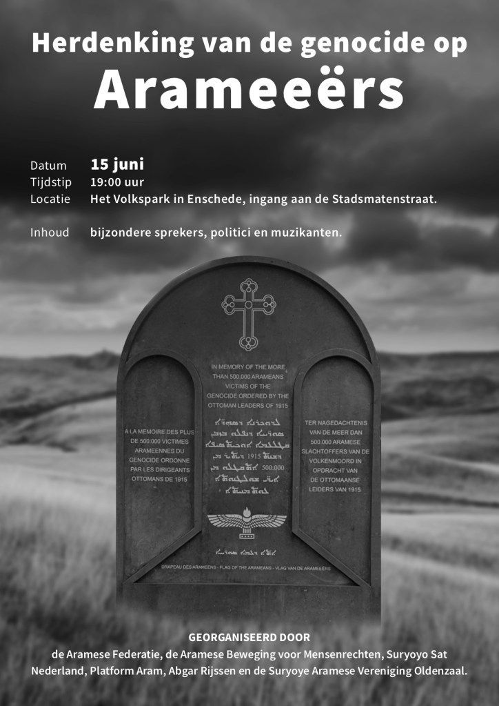 Op dinsdag 15 juni 2021 organiseren Aramese organisaties een herdenking van de genocide op Arameeërs die plaatsvond in 1915. Het programma bevat onder andere toespraken van politici en optredens van diverse muzikanten. Ook nemen Turkse Nederlanders deel aan deze herdenking. Het programma start om 19.00 uur in het volkspark (ingang aan de Stadsmatenstraat).