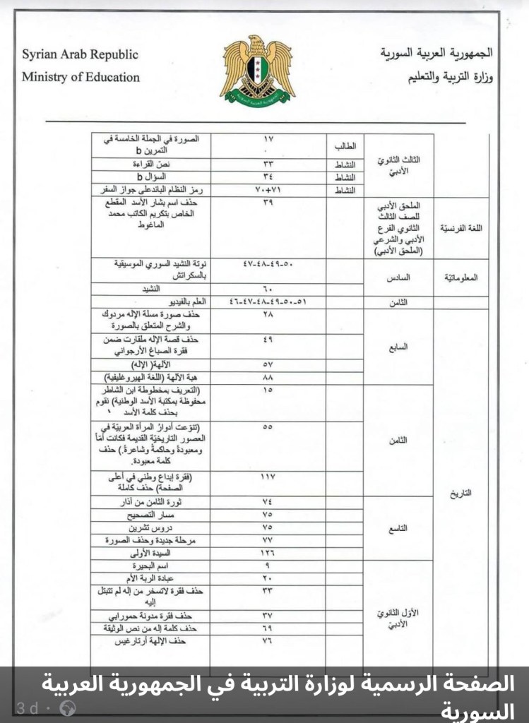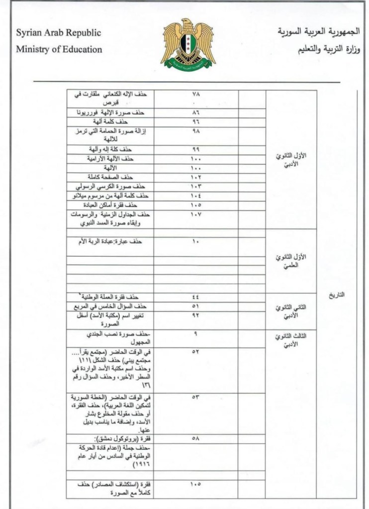 - 6 mei, de herdenkingsdag van de door de Turken geëxecuteerde Syrische leiders, is uit het curriculum geschrapt.