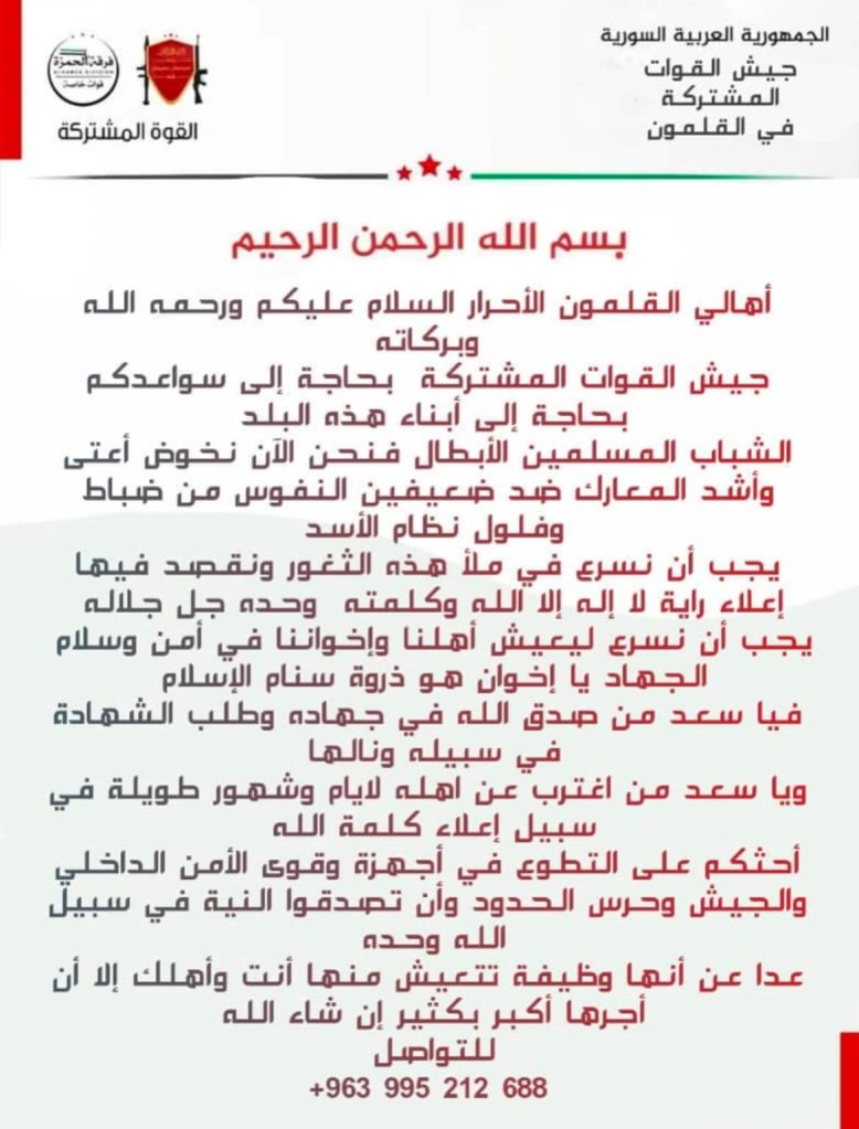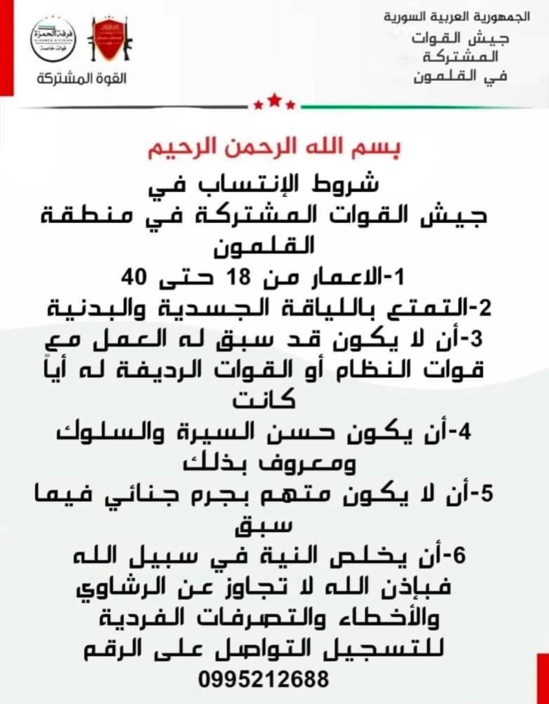 - De islamitische groepering Hay’at Tahrir al-Sham (HTS) rekruteert uitsluitend moslims voor het nieuwe Syrische leger (bijlage 4.1 & 4.2). Op officiële HTS-documenten staat expliciet vermeld dat men op zoek is naar moslimjongeren voor het leger.